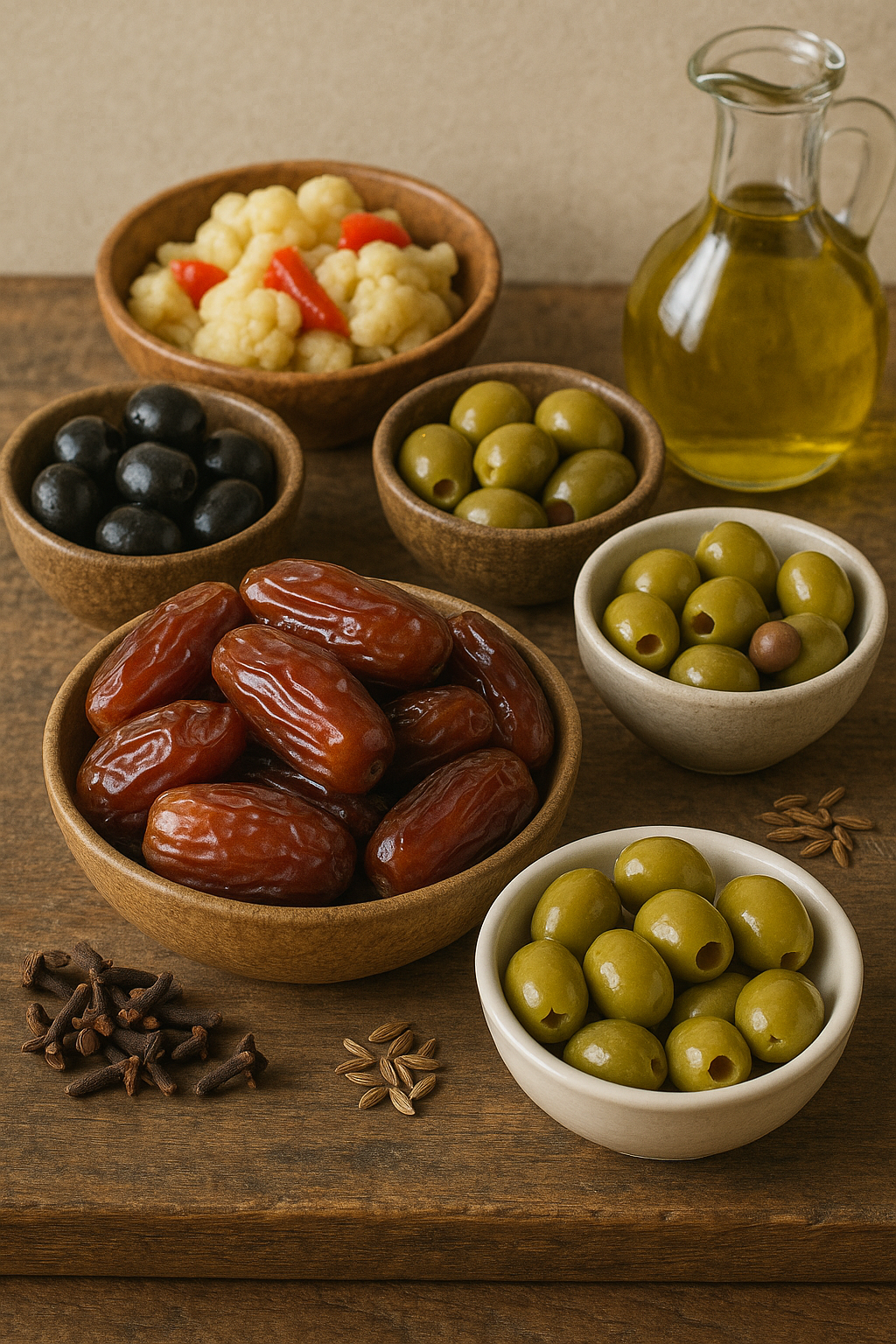 Ausgewählte Feinkost wie Datteln, Oliven & Antipasti.